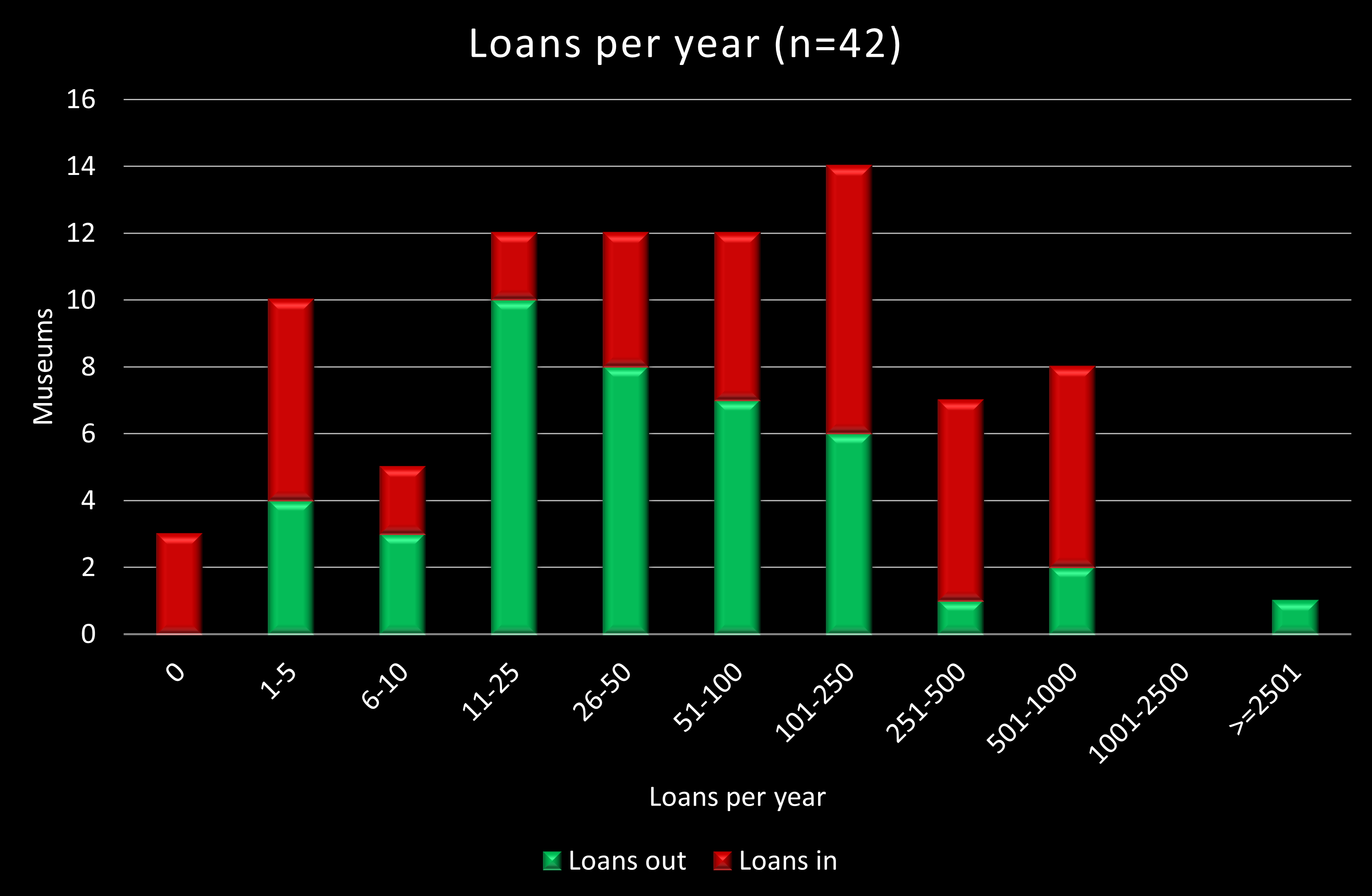 In order to visualise data in a relatively useful form, individual figures have been assigned to bands, arranged in a roughly (but not strictly) logarithmic scale; these have been plotted against the number of museums reporting a figure within the relevant band. Figures for loans out (generally less time-consuming) are in green; those for loans in are in red.
