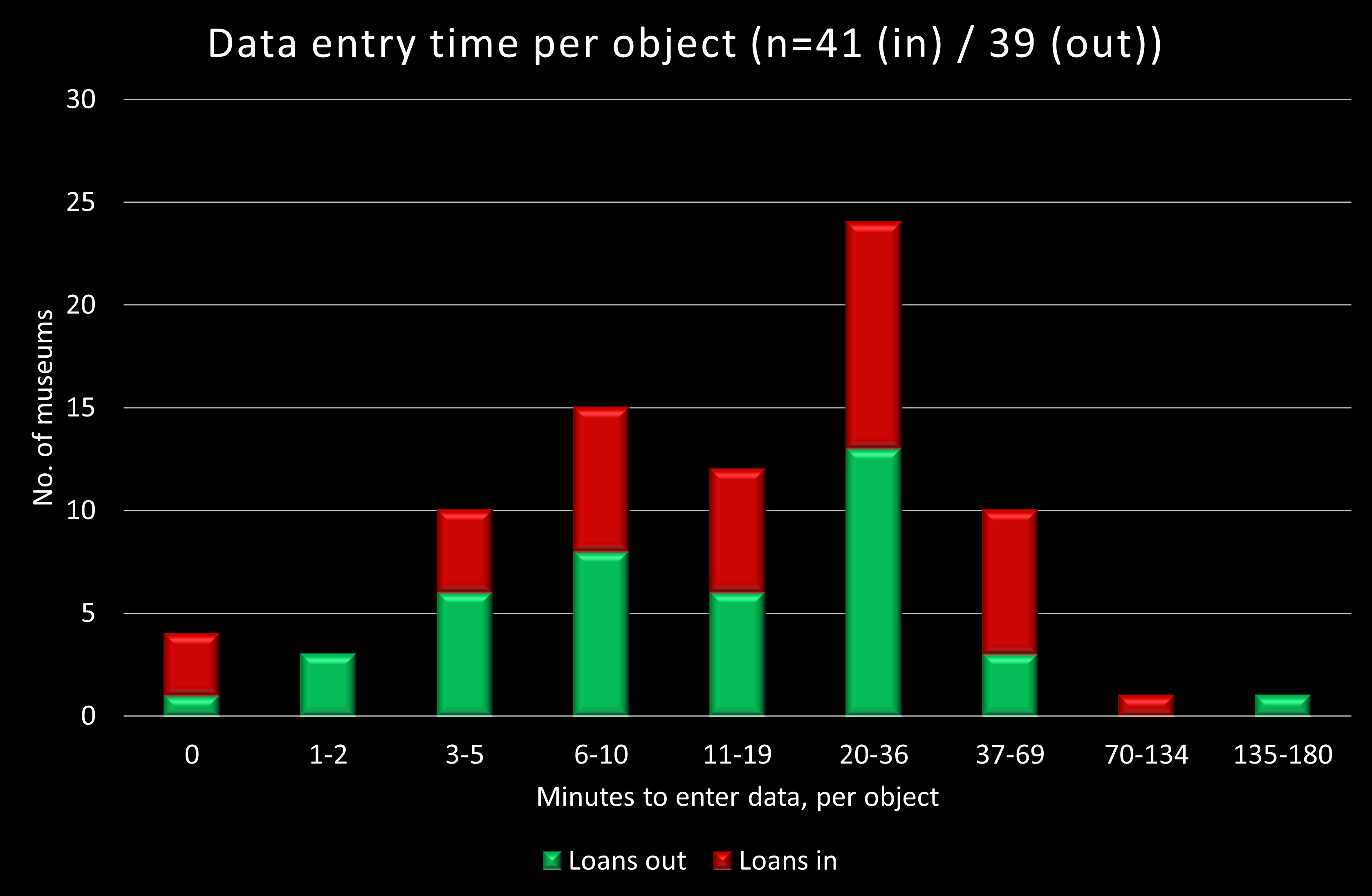 Graph plotting minutes taken to enter data per museum object for loans out and in, against the number of museums reporting the relevant time